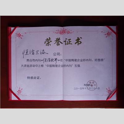 獎 項:《恒潔視界》“中國陶瓷企業(yè)好內(nèi)刊”五強(qiáng)